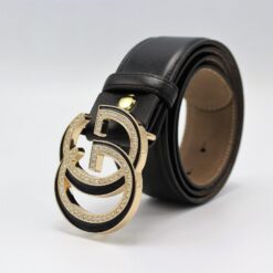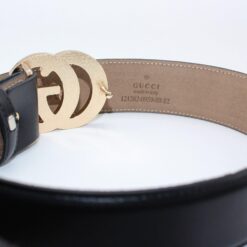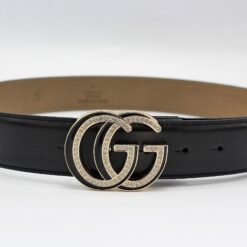 The Double G, inspired by an archival design, is further enhanced by pearl effect studs. Diamonds are a romantic symbol and are incorporated throughout Gucci’s collections. The buckle sits on a leather strap in black.