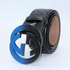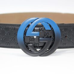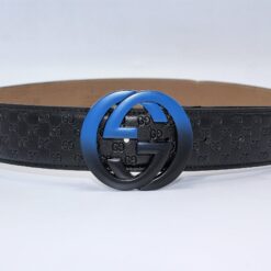 The Gucci Signature Leather with Black & Blue Buckle combines premium craftsmanship and luxury. Made from black leather, it features the iconic Interlocking G buckle with a striking black and blue color scheme. This designer belt is perfect for casual and semi-formal occasions, providing both sophistication and comfort.