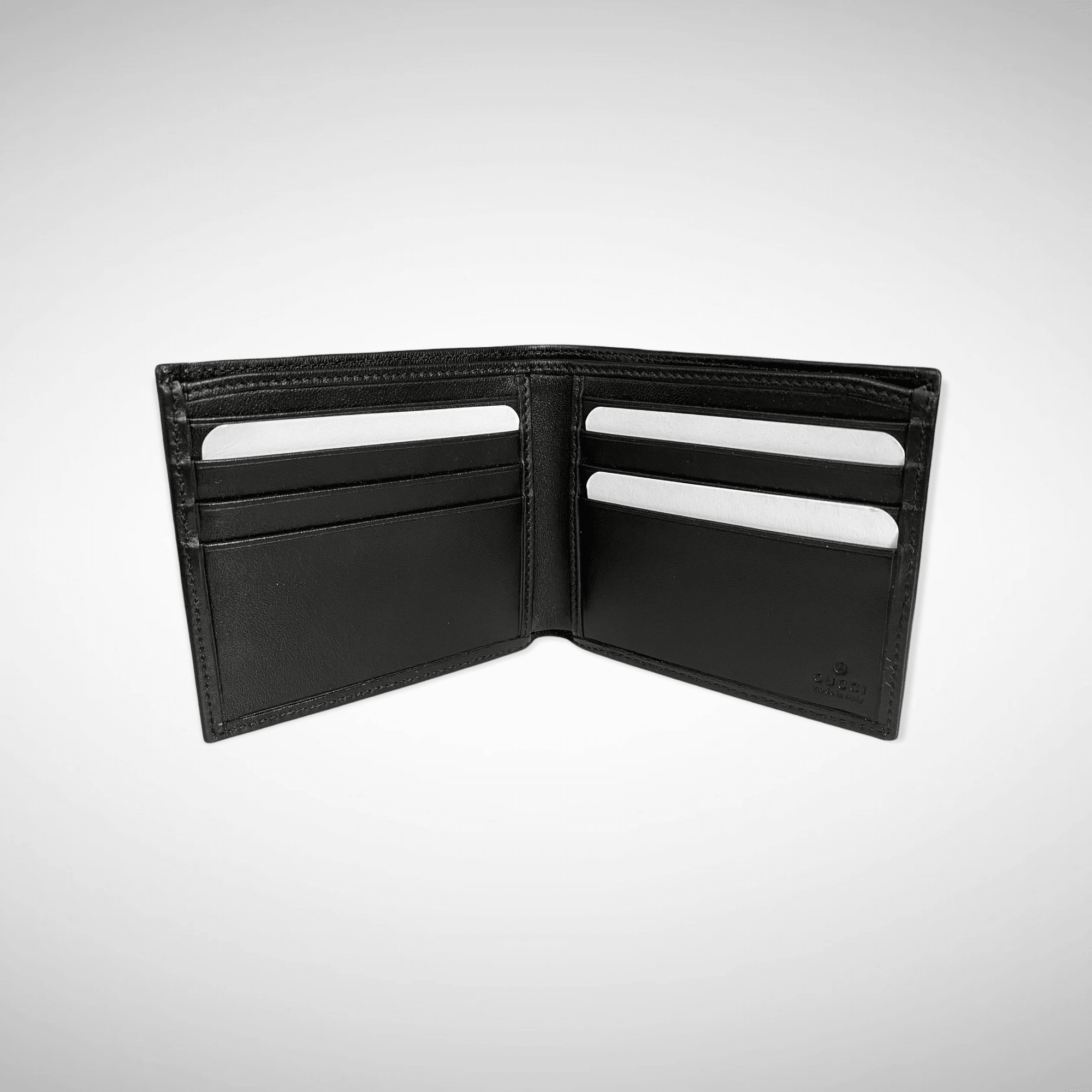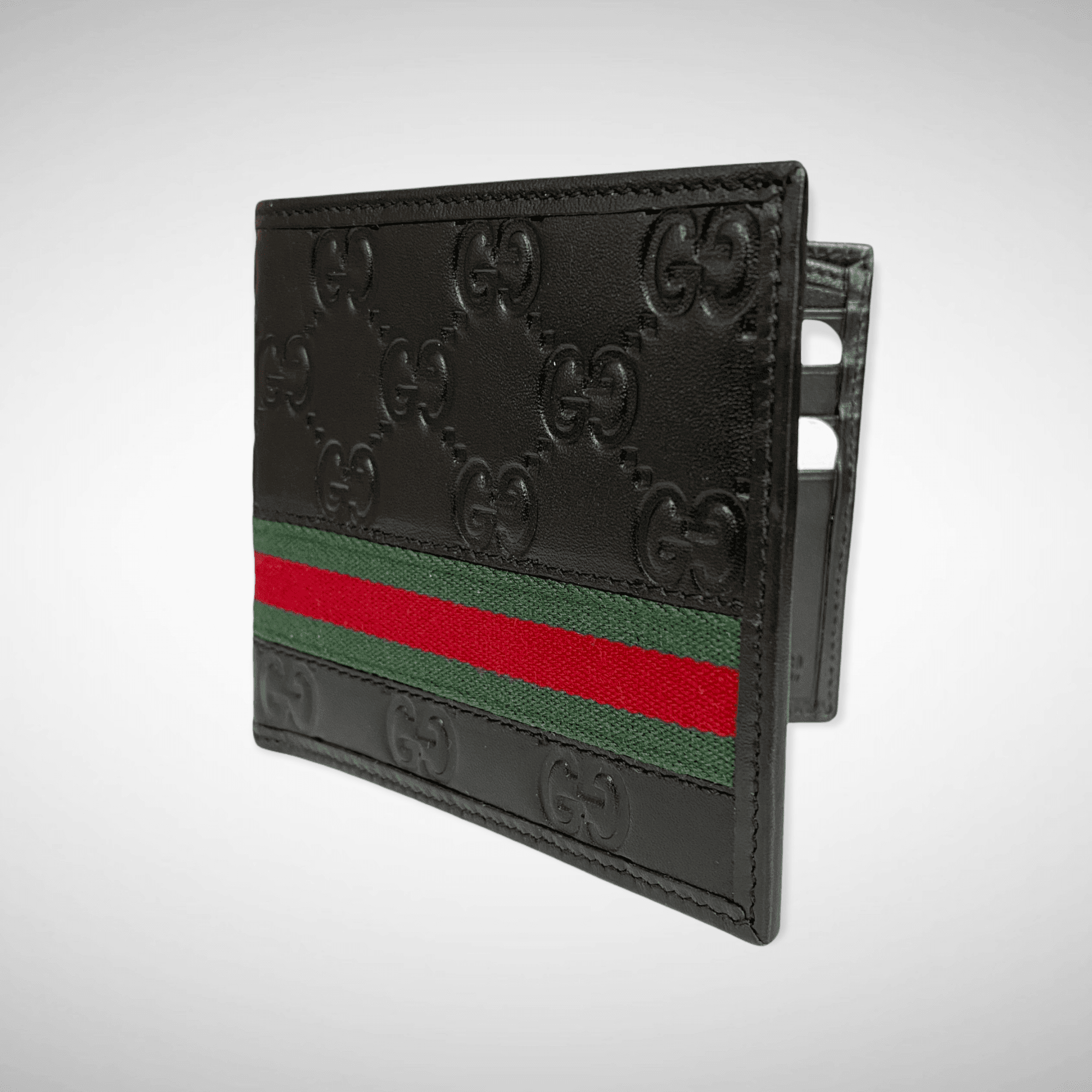 A combination of two of Gucci’s most recognisable icons: the GG motif and the Web. This bi-fold wallet is made in heat debossed Gucci Signature with Gucci Web stripe detail.