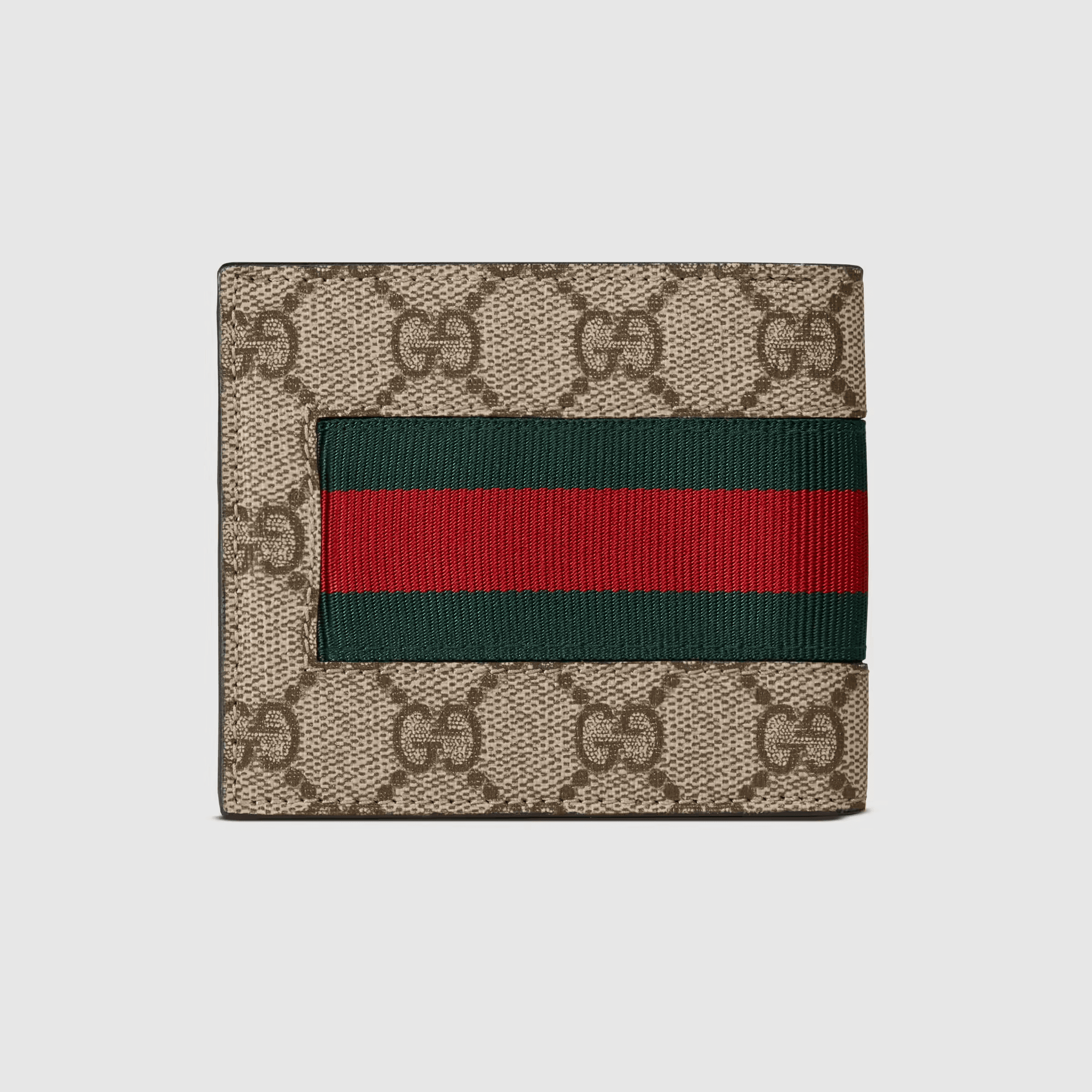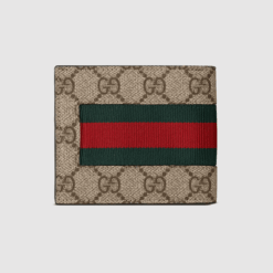 This Gucci Web GG Supreme wallet is a luxurious blend of practicality and style. Made from sustainable GG Supreme canvas, this wallet features the iconic red and green Web design. With multiple compartments for cards and bills, it combines elegance and functionality. The wallet’s brown leather details and hand-painted edges make it a timeless accessory for any collection.